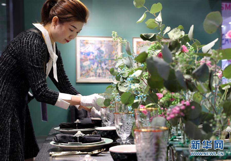 11月5日,在第二屆進(jìn)博會(huì)品質(zhì)生活展區(qū),工作人員在一家丹麥家居產(chǎn)品的展臺(tái)前忙碌。新華社記者劉穎攝