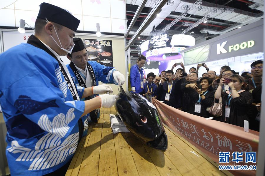 11月7日,來自日本長崎魚市株式會社的專業(yè)切魚師傅為解體70公斤藍(lán)鰭金槍魚做準(zhǔn)備。第二屆中國國際進口博覽會正在上海國家會展中心舉行。博覽會的食品及農(nóng)產(chǎn)品展區(qū)里匯集了來自世界各地的美食,同時也上演各種精彩美食秀。11月7日,來自日本長崎魚市株式會社的專業(yè)切魚師傅現(xiàn)場解體一條70公斤的藍(lán)鰭金槍魚,吸引大量參觀者觀看、品嘗。新華社記者王鵬攝