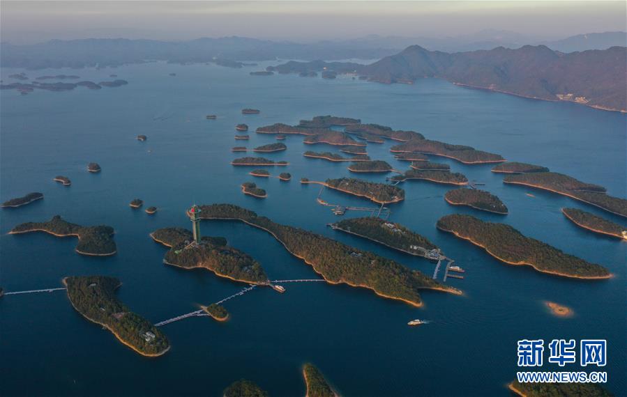 11月9日無人機(jī)拍攝的廬山西海。 當(dāng)日,落日余暉下的江西廬山西海山青水藍(lán),美不勝收。 新華社記者 周密 攝