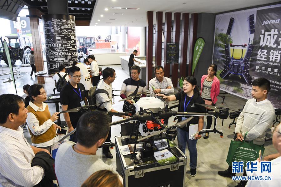11月16日,參展商在展會現(xiàn)場給參觀者介紹植保無人機的使用方法。新華社記者曹祎銘攝