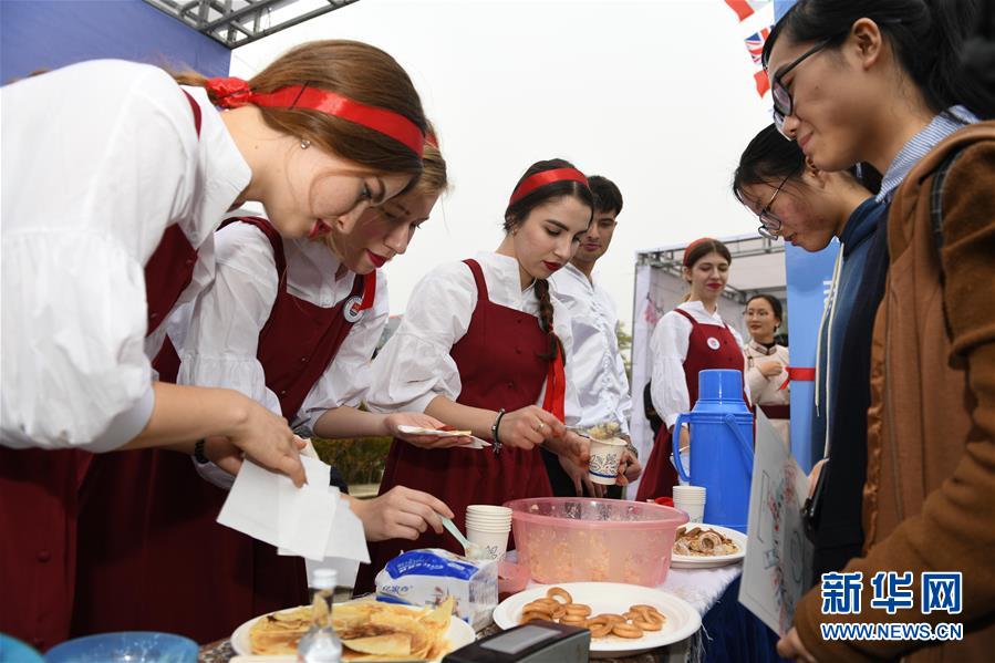 11月17日,來(lái)自俄羅斯的留學(xué)生在國(guó)際文化節(jié)上將自己制作的美食給觀眾品嘗。 新華社記者 張端 攝
