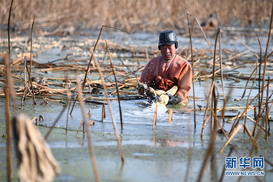 來(lái)自淮南的挖藕人王公平在肥西縣豐樂鎮(zhèn)一蓮藕種植基地收獲蓮藕。新華社記者劉軍喜攝