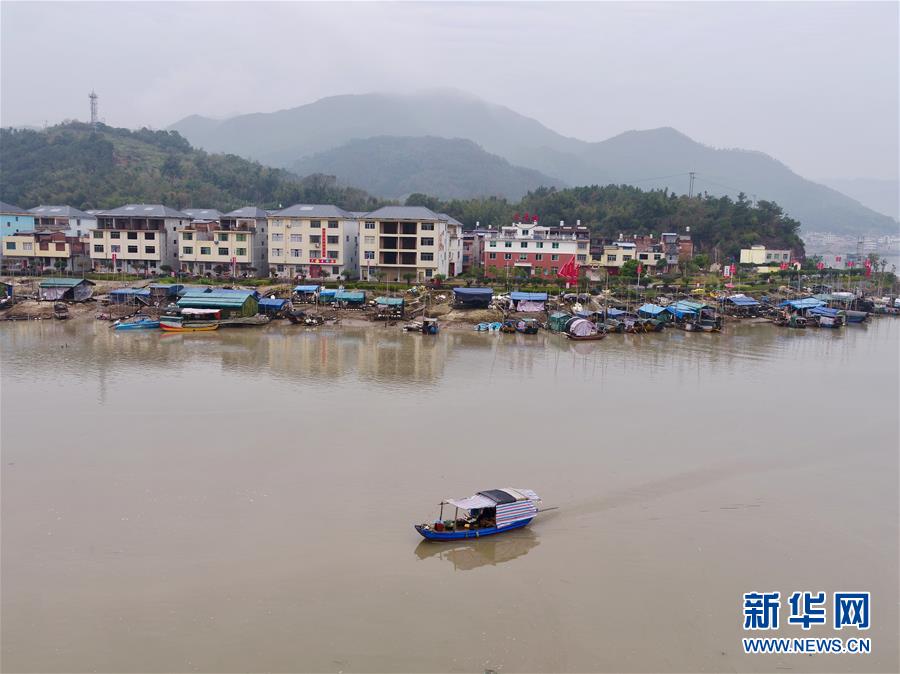在寧德福安市溪邳村,一艘漁船經(jīng)過(guò)岸上新居(3月8日無(wú)人機(jī)拍攝)。新華社記者姜克紅攝