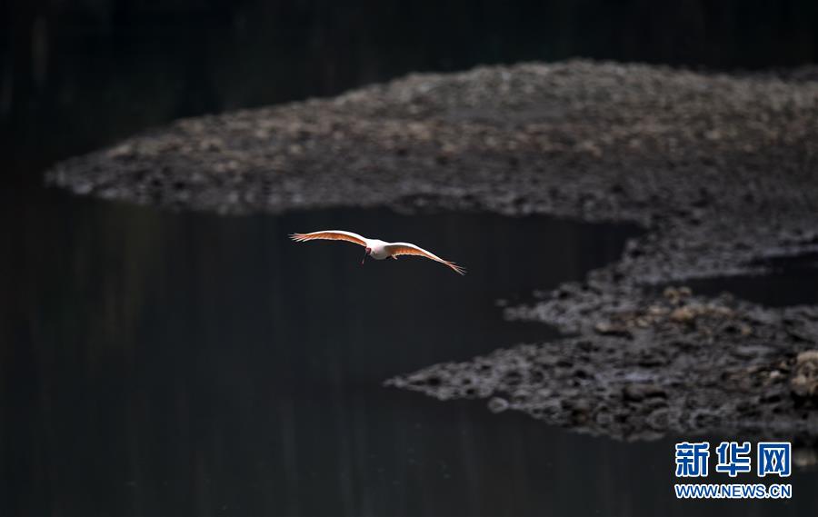 11月19日,朱鹮飛翔在漢江支流的牧馬河畔。  每年冬季,成群結(jié)隊的朱鹮飛翔在漢江及漢江支流的河灘、濕地,覓食、棲息,成為當?shù)匾坏懒聋惖娘L景線。  新華社記者陶明攝