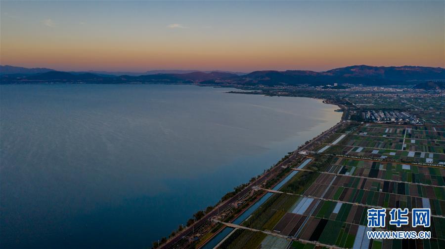 這是云南省玉溪市通??h的田園風(fēng)光(11月23日無人機拍攝)。初冬時節(jié),云南省玉溪市通??h風(fēng)景秀麗,山巒、湖水與農(nóng)田組成了一幅美麗的田園詩畫卷。新華社記者胡超攝