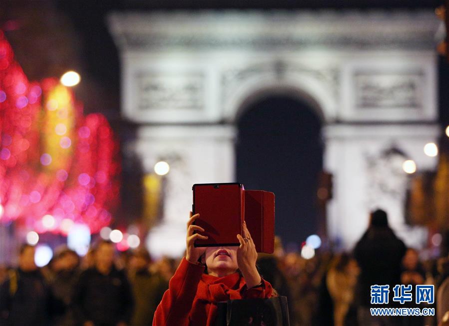 11月24日,在法國巴黎,一名女子在香榭麗舍大街點燈儀式上拍照。當日,法國巴黎香榭麗舍大街點亮彩燈迎圣誕。從即日起至1月8日,整條香榭麗舍大街都將被喜慶的節(jié)日燈飾點亮。新華社記者高靜攝