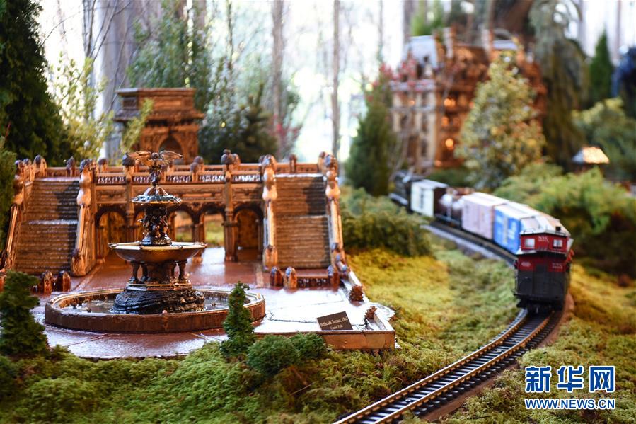 11月26日,在美國(guó)紐約植物園節(jié)日小火車展上,一輛模型小火車駛過(guò)紐約中央公園貝塞斯達(dá)噴泉和臺(tái)階微縮模型。新華社記者韓芳攝