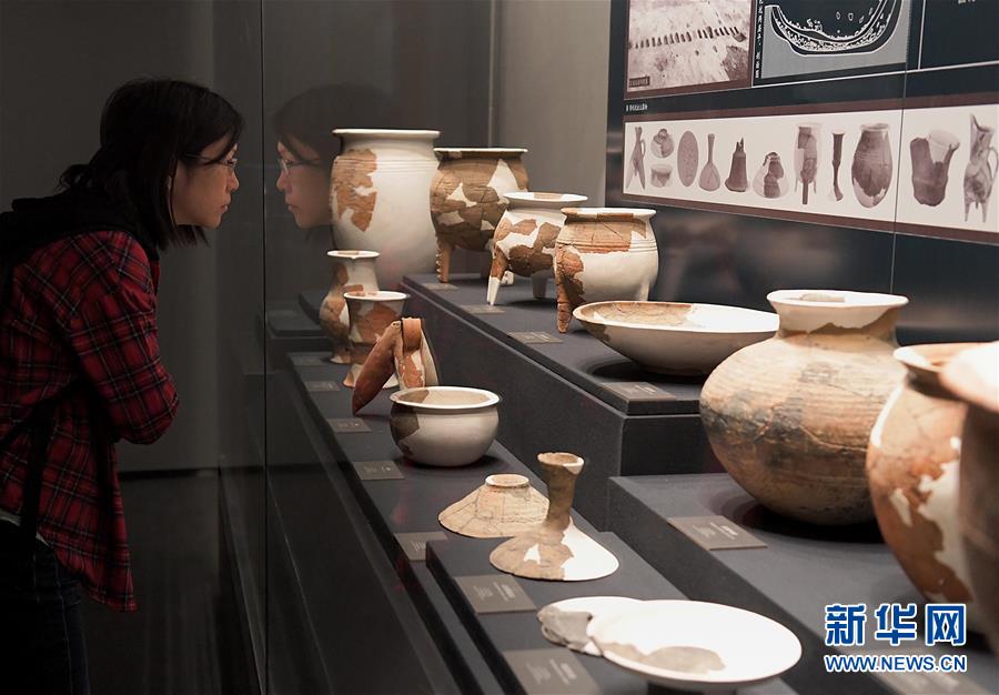 10月19日,參觀者在二里頭夏都遺址博物館內(nèi)觀看展出的陶器。新華社記者李安攝