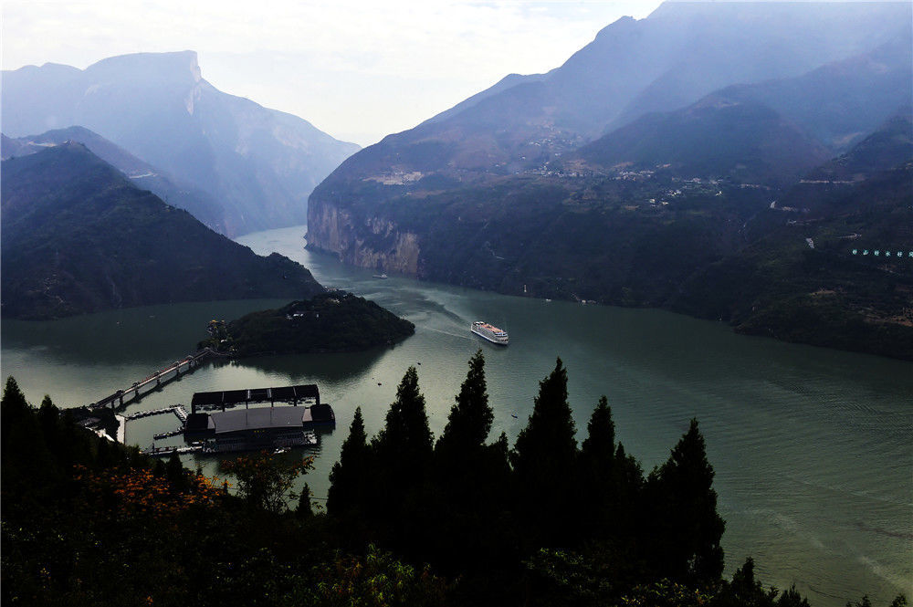 2019年11月3日,重慶,四面環(huán)水的“白帝城孤島”風(fēng)貌,各種豪華游輪陸續(xù)駛往寶塔坪旅游碼頭,供游客們登島參觀。