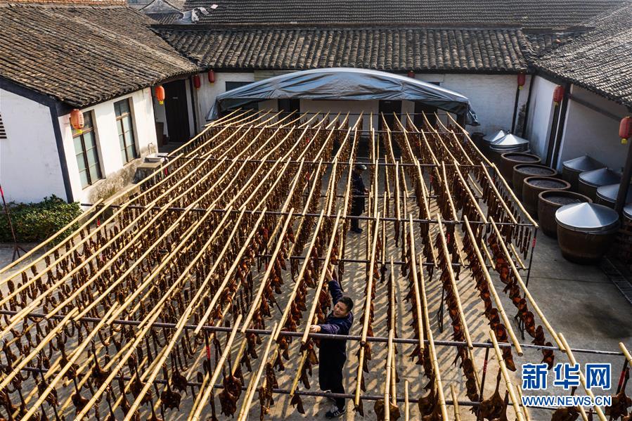 初冬時節(jié),浙江省紹興市柯橋區(qū)安昌古鎮(zhèn)開啟了傳統(tǒng)臘味制作、上市的季節(jié)。當(dāng)?shù)匕傩沼脗鹘y(tǒng)醬油、黃酒、香料等手工腌制臘腸、醬鴨、魚干、醬鵪鶉、醬排骨等紹興特色醬貨,在冬季的陽光下進行晾曬,滿街飄香的臘味也成了這座江南古鎮(zhèn)的獨特風(fēng)景。安昌古鎮(zhèn)是浙江省歷史文化名鎮(zhèn),有著一千多年歷史,比較完善地保存了古吳越地區(qū)沿襲千百年來的民俗風(fēng)情。每年大雪節(jié)氣前后,安昌當(dāng)?shù)匕傩瞻凑諅鹘y(tǒng)習(xí)俗挑選晴朗好天氣制作、晾曬傳統(tǒng)醬貨,各類醬貨顏色黑紅油亮,咸鮮適口,是當(dāng)?shù)囟镜奶厣珎鹘y(tǒng)美食。新華社記者徐昱攝