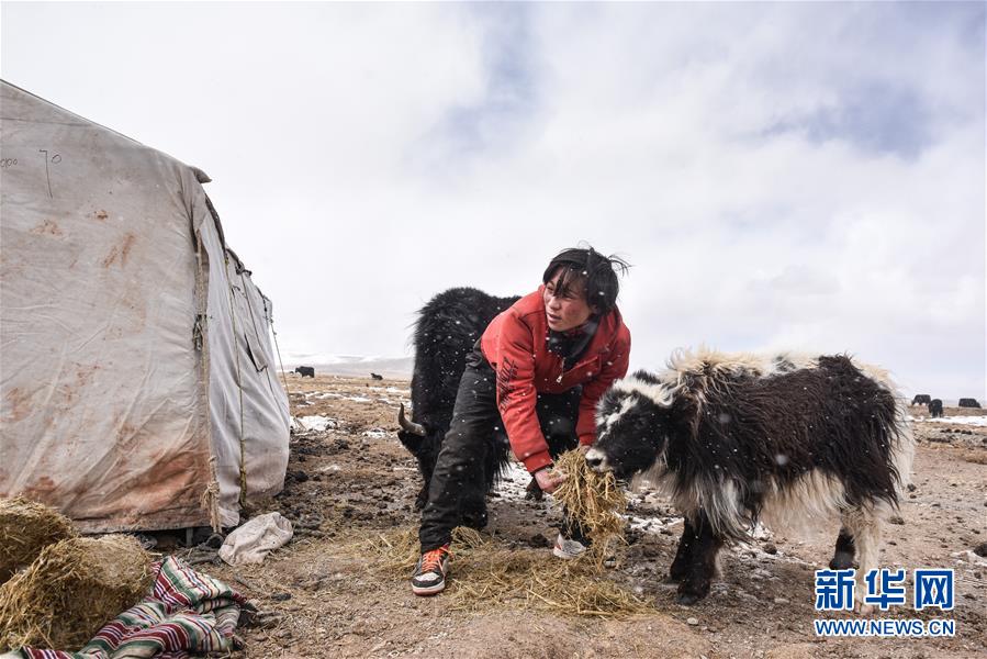 2月22日,才巴拉加在麥雄灘的帳篷前給牛犢喂飼料。今年年初,青海省玉樹藏族自治州遭遇重度雪災,部分地區(qū)積雪深度超過半米,牲畜覓食困難,餓死凍死超2萬頭只。麥雄灘位于巴顏喀拉山腳下的玉樹藏族自治州稱多縣清水河鎮(zhèn)文措村,是此次玉樹雪災中化雪較快、接納受災轉場外地牧民最多的地點之一。文措村黨支部書記白尕召集村民開會,大家一致同意拿出30萬畝草場,供受災更嚴重的其他地區(qū)牧民使用。新華社記者吳剛攝