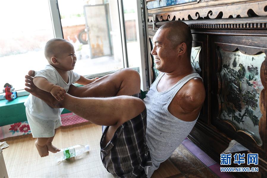 8月8日,王剛與兒子“肉肉”在家中玩耍。33歲的王剛來自遼寧省鐵嶺市昌圖縣兩家子鎮(zhèn)河西村。作為父親,王剛雖然沒有堅實的臂膀去擁抱自己的孩子,但他一直努力用自己的方式呵護照顧家人?!盁o臂爸爸”的父愛給很多人帶來了力量和鼓舞,被人親切地稱為“最強爸爸”。新華社記者潘昱龍攝