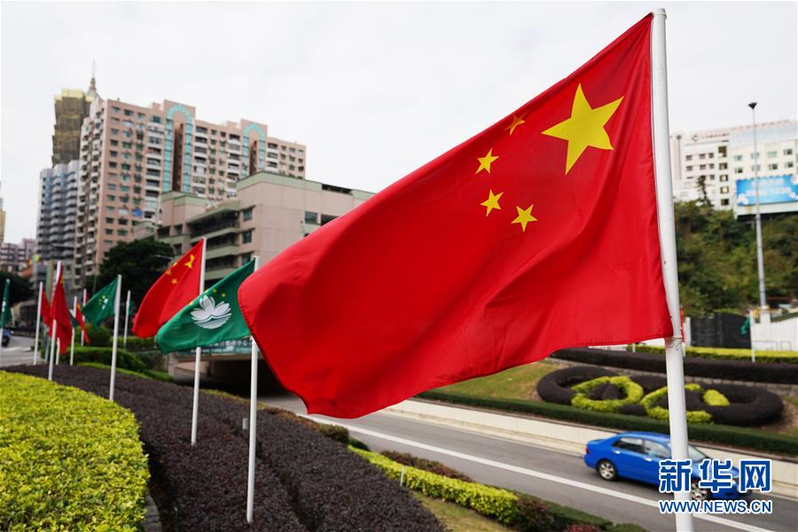 12月17日,在澳門街頭,國旗和區(qū)旗迎風(fēng)飄揚(yáng)。