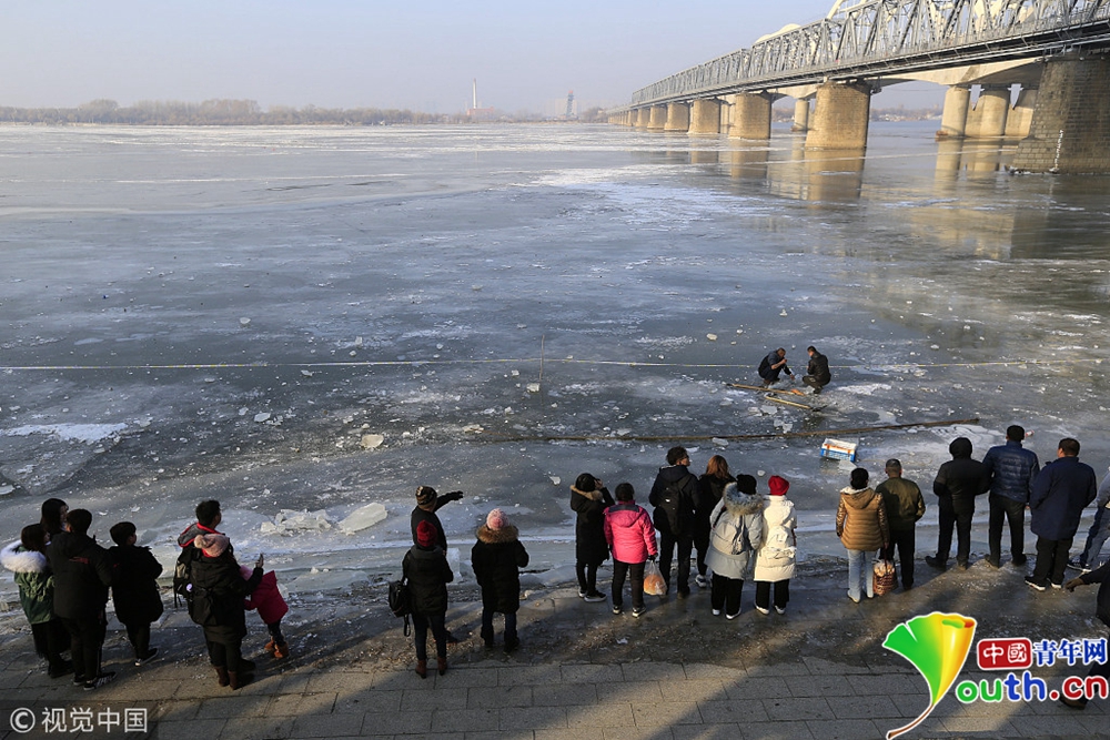 哈爾濱松花江封江市民鑿冰捕魚(yú)