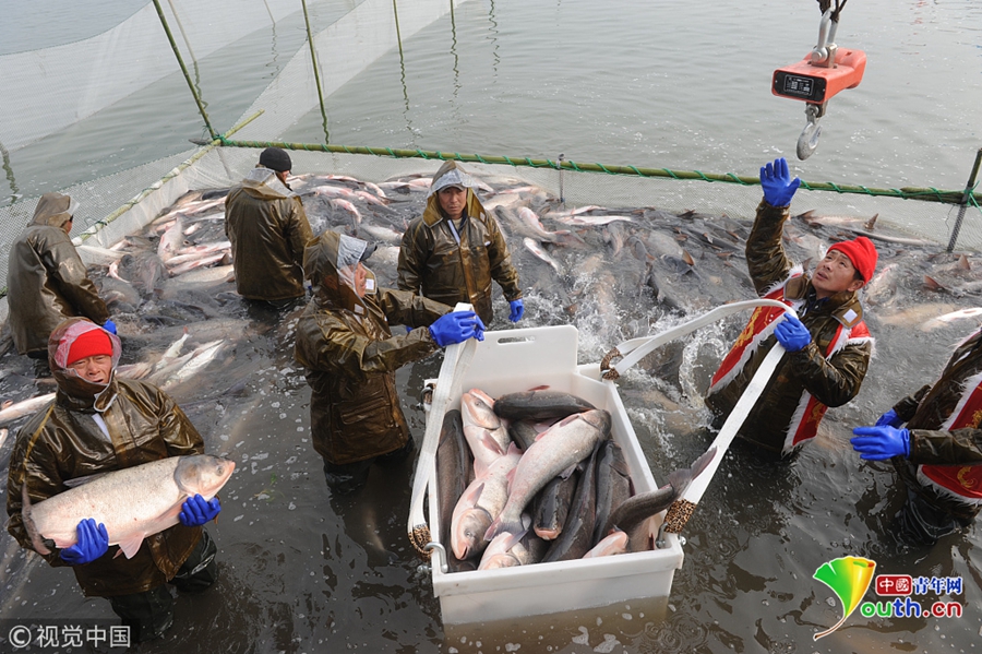 江蘇揚(yáng)州,漁夫?qū)Ⅳ~(yú)撈出過(guò)秤。