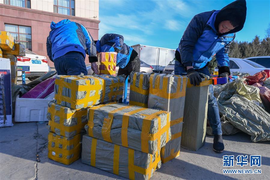 12月27日,在吉林松原查干湖漁場(chǎng),快遞員將魚(yú)打包準(zhǔn)備發(fā)給客戶。新華社記者張楠攝