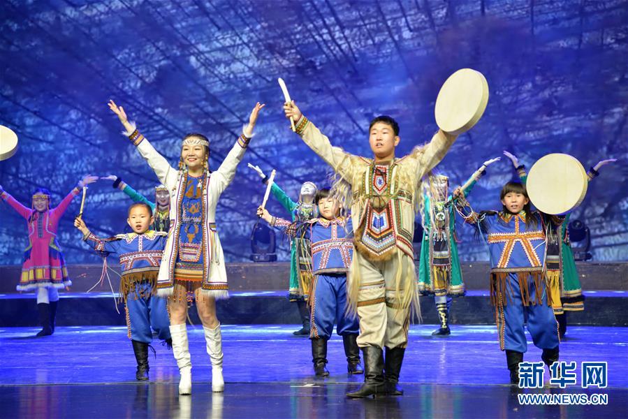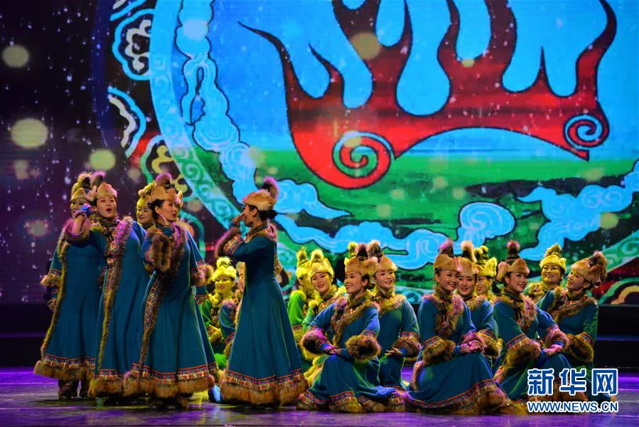 12月22日,演員在表演歌舞《敖魯古雅》。 當日,冰雪之約——喜迎“十四冬”惠民文藝演出在呼倫貝爾大劇院舉行,為觀眾呈現(xiàn)一場“歌舞盛宴”。 新華社記者 徐欽 攝