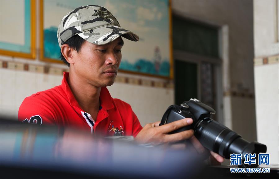 海南清瀾港省級(jí)自然保護(hù)區(qū)護(hù)林員呂詩(shī)陽在保護(hù)區(qū)內(nèi)的辦公室里查看自己拍攝的照片(12月17日攝)。 新華社記者楊冠宇攝