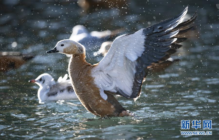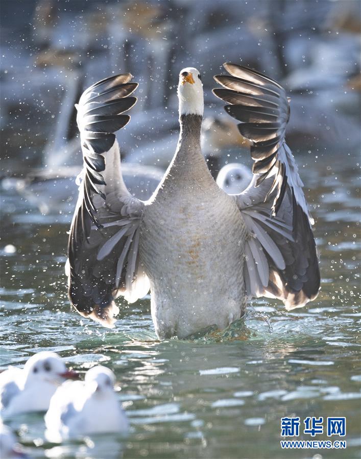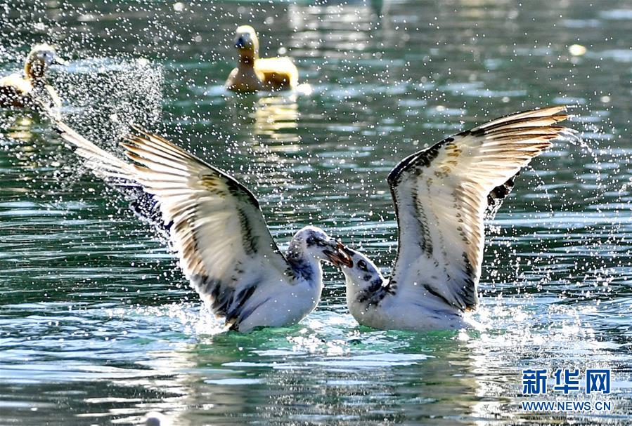 11月21日,候鳥在拉薩龍王潭公園水中嬉戲。時下,斑頭雁、紅嘴鷗等不少候鳥陸續(xù)飛抵拉薩河谷、雅魯藏布江沿岸等地避寒。新華社記者普布扎西攝