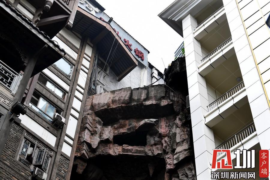 2019年10月24日,重慶渝中區(qū),兩棟樓房中間就是斷崖,斷崖上面是車來車往的滄白路,而下方則是人來人往的洪崖洞景區(qū),給人一種魔幻8D既視感,引發(fā)外地游客感嘆。