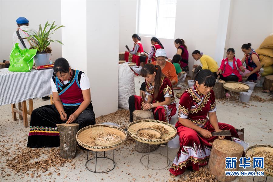 在大興地鎮(zhèn)維拉壩“珠海小區(qū)”內的農產品加工扶貧車間,村民們在剝核桃仁(6月24日攝)。新華社記者胡超攝