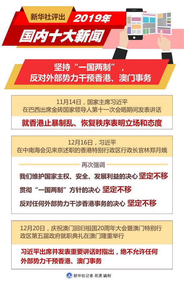 11月14日,國家主席習(xí)近平在巴西出席金磚國家領(lǐng)導(dǎo)人第十一次會晤期間發(fā)表講話,就香港止暴制亂、恢復(fù)秩序表明立場和態(tài)度。12月16日,習(xí)近平在中南海會見來京述職的香港特別行政區(qū)行政長官林鄭月娥,再次強調(diào)我們維護國家主權(quán)、安全、發(fā)展利益的決心堅定不移,貫徹“一國兩制”方針的決心堅定不移,反對任何外部勢力干涉香港事務(wù)的決心堅定不移。12月20日,慶祝澳門回歸祖國20周年大會暨澳門特別行政區(qū)第五屆政府就職典禮在澳門隆重舉行,習(xí)近平出席并發(fā)表重要講話時指出,絕不允許任何外部勢力干預(yù)香港、澳門事務(wù)。