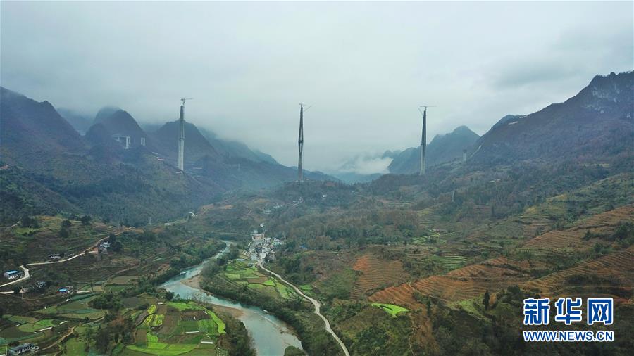 2019年1月7日無(wú)人機(jī)航拍的平塘特大橋橋塔全景,中為高332米的世界第一高混凝土橋塔。新華社記者歐東衢攝