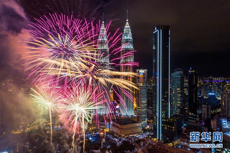 2020年1月1日,焰火在馬來西亞吉隆坡的馬來西亞國家石油公司雙塔旁綻放,迎接新年的到來。新華社記者朱煒攝