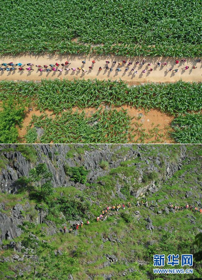 拼版照片:上圖為在大化瑤族自治縣板升鄉(xiāng)弄勇村,孩子們走在放學路上(5月10日無人機拍攝);下圖為在弄勇村弄頂屯,孩子們扛著生活用具,走山路回家(2012年7月4日攝)。新華社記者黃孝邦攝