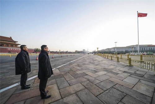 2019年12月7日,新任香港特區(qū)政府警務(wù)處處長(zhǎng)鄧炳強(qiáng)(右)率香港警務(wù)處代表團(tuán)來到北京天安門廣場(chǎng),觀看升國(guó)旗儀式。新華社記者殷剛攝