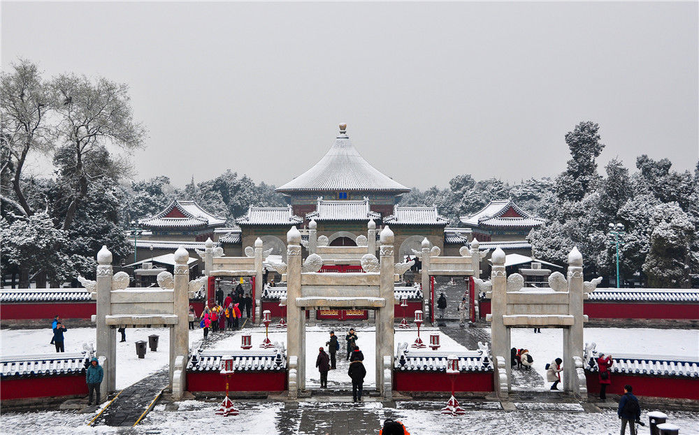 2019年11月30日,北京,初雪過(guò)后,天壇公園銀裝素裹,白雪古建相互映襯,景色迷人。天壇公園里觀雪賞景的市民絡(luò)繹不絕。喬?。垐D像/視覺(jué)中國(guó)