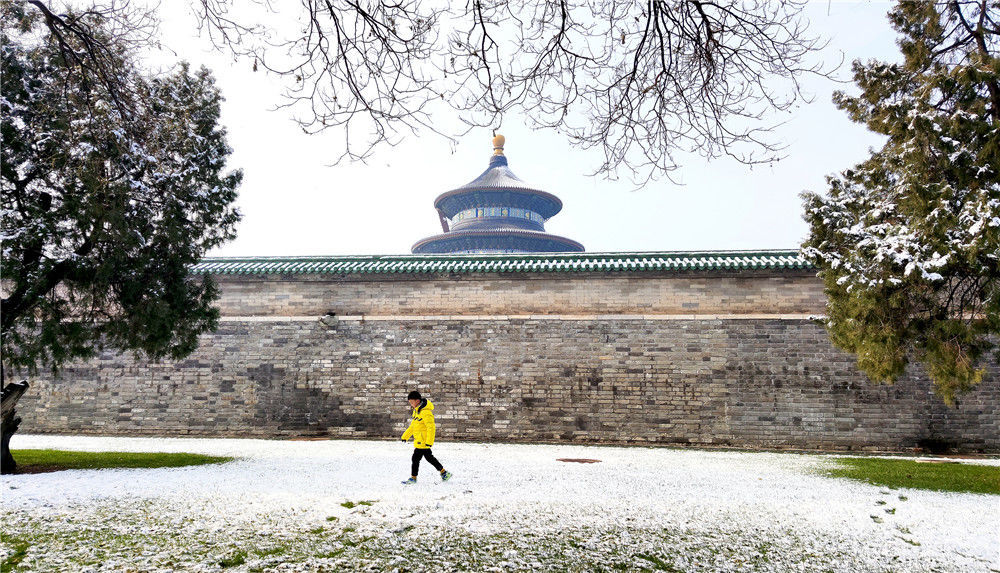12月16日,在北京天壇公園,一名市民雪中健身。當(dāng)日,北京迎來(lái)降雪天氣。新華社記者鞠煥宗攝