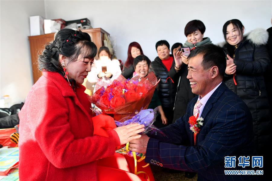 在和順縣李陽鎮(zhèn)南李陽村,新郎馬愛明將花送給新娘溫麗芳(2019年12月31日攝)。 農(nóng)歷臘月初六,是山西省和順縣李陽鎮(zhèn)下石勒村45歲的馬愛明娶媳婦的日子。 地處太行山區(qū)的下石勒村曾深陷貧困,“地下無資源、地上沒產(chǎn)業(yè)”是這里的真實(shí)寫照。2013年,村里638口人中有511口屬貧困人口。村民在貧瘠的坡地上種的玉米、谷子等僅夠糊口,外村女子都不愿嫁到這里。和村里多數(shù)人一樣,貧困戶馬愛明不得不在農(nóng)閑時出去打工補(bǔ)貼家用。東走走、西走走,馬愛明沒攢下錢,也沒遇見合適的人,婚事一拖再拖,成了大齡“光棍”。 2013年以來,在國家強(qiáng)有力的政策幫扶和基層黨組織的帶領(lǐng)下,下石勒村以合作社的形式發(fā)展起肉牛養(yǎng)殖、雙孢菇種植、萬壽菊種植等集體產(chǎn)業(yè)。下石勒村經(jīng)濟(jì)有了起色,外出打工的村民紛紛回村。馬愛明加入了村里的建筑隊(duì),閑時還到種植專業(yè)合作社打工,一年四季都有活干。加上土地流轉(zhuǎn)的收入,馬愛明一年能收入三萬多元。2016年,下石勒村實(shí)現(xiàn)整村脫貧。 2019年,馬愛明結(jié)識了在下石勒村肉雞養(yǎng)殖專業(yè)合作社打工的李陽鎮(zhèn)南李陽村村民溫麗芳,馬愛明的樸實(shí)、善良、勤勞打動了溫麗芳,兩人擦出了愛情的火花。 臘月初六這天,下石勒村鑼鼓喧天,嗩吶齊鳴。在鄉(xiāng)親們的見證下,馬愛明手牽新娘,大聲宣布:“我脫單了!我的幸福生活開始了!” 新華社記者 詹彥 攝