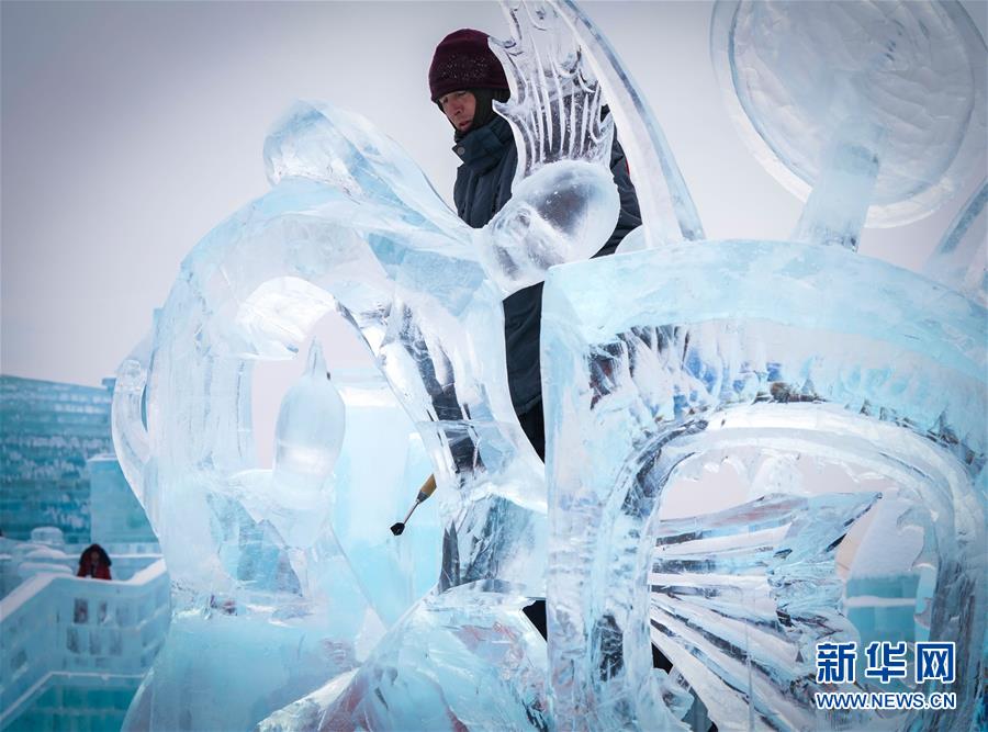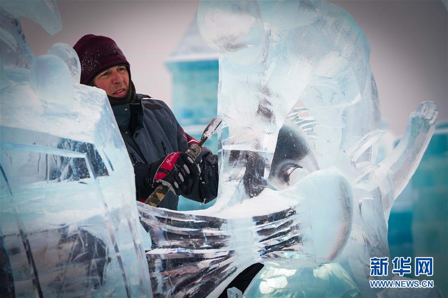 第九屆中國·哈爾濱國際組合冰雕比賽選手在哈爾濱冰雪大世界內(nèi)制作冰雕(1月2日攝)。新華社記者王松攝