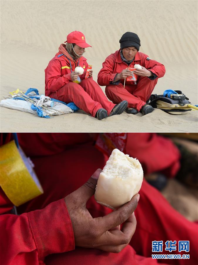 這是一張拼版圖片:上圖為測量工周國燕(左)和丈夫杞朝金在沙漠中解決午餐(1月13日攝);下圖為測量工周國燕在吃冰涼的饅頭(1月13日攝)。地球物理勘探是油氣開發(fā)的第一步,相當(dāng)于給地球做CT。物探工人按照嚴(yán)格的測線部署,在相應(yīng)位置鉆井,然后實施地震,采集地震波數(shù)據(jù)??蒲腥藛T通過數(shù)據(jù)組成的“CT片”,就能夠清晰地“看”到地下的地質(zhì)結(jié)構(gòu),判斷哪里埋藏有石油或者天然氣。2019年10月,東方地球物理勘探有限責(zé)任公司塔里木物探處2113隊進(jìn)入新疆塔克拉瑪干沙漠腹地,開始中古14-21、塔中2兩個區(qū)塊的三維地震勘探。近2000名物探工人將在1000平方公里的范圍內(nèi)一直工作到2020年4月,這也意味著他們將在塔克拉瑪干沙漠腹地連續(xù)度過第14個除夕夜。蘊(yùn)藏著豐富石油天然氣資源的新疆塔克拉瑪干沙漠有“死亡之?!敝Q,氣候干燥,年降水量在50毫米以下,冬季地表最低溫度超過零下30攝氏度,是世界油氣勘探難度最大的地區(qū)之一。為避開風(fēng)季,物探工人每年9、10月份進(jìn)入沙漠,一直工作到來年4月,夜以繼日與黃沙、嚴(yán)寒為伴,用辛勤的汗水,為祖國找油找氣。新華社記者丁磊攝
