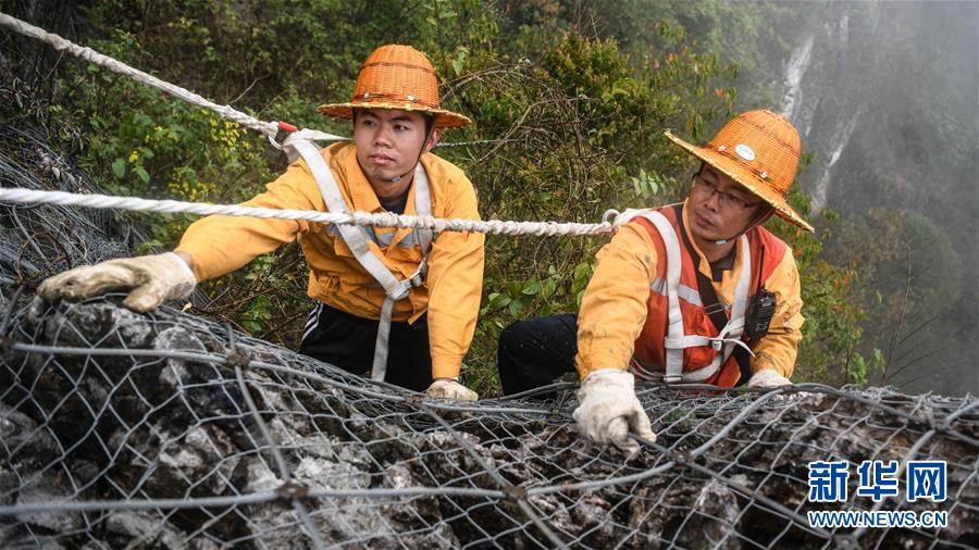 1月14日,百色工務段白水河橋隧工區(qū)班組工長王勇(右一)和同事在處理危石。在中國鐵路南寧局集團公司百色工務段白水河橋隧工區(qū),有一個由14名工人組成的班組。他們常年像“爬山虎”一樣行走攀爬在地形險峻、云霧繚繞的高山上,負責南昆鐵路轄區(qū)路段的搜山掃石工作,清除一切可能危害鐵路行車安全的因素,保障旅客出行安全。新華社記者張愛林攝