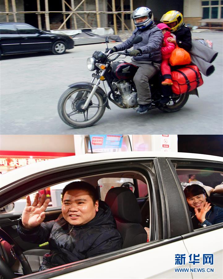 拼版照片:上圖是董日旭帶著家人騎摩托車返鄉(xiāng)過年(資料照片,2013年2月2日攝),下圖是董日旭開著他新買的汽車,帶家人來到中國石油泉州博覽大道加油站領(lǐng)加油卡(1月15日新華社記者魏培全攝)。