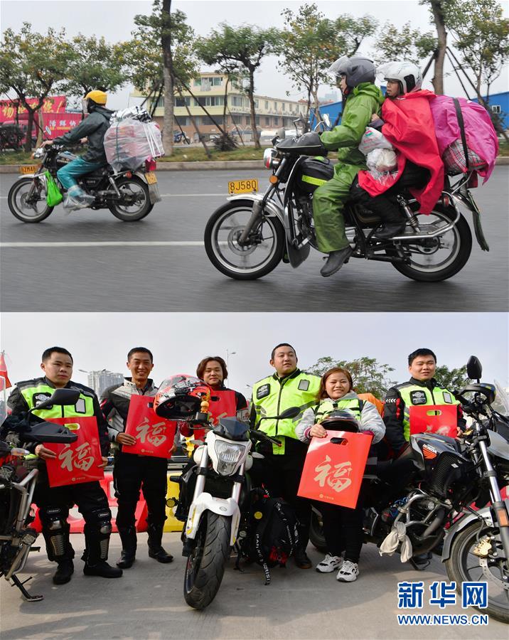 拼版照片:上圖是江西、安徽和湖北籍農(nóng)民工組成的返鄉(xiāng)“鐵騎大軍”騎行在返鄉(xiāng)路上(2014年1月23日攝);下圖是“90后”外來務工返鄉(xiāng)青年冉曉紅(左三)和騎友們在中石油漳州龍江路加油站合影留念(1月15日攝)。20歲的冉曉紅是重慶人,在福建廈門從事餐飲業(yè),2019年買了一輛高檔摩托車,2020年與朋友結伴騎摩托車返鄉(xiāng),路上預計需要五天時間。 新華社記者 魏培全 攝