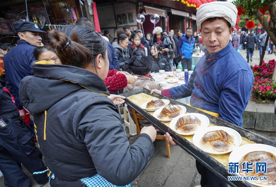 1月18日,在中山古鎮(zhèn)的“千米長宴”上,民間藝人用古鎮(zhèn)傳統(tǒng)“打盆”絕藝給游客們上菜。當(dāng)日中午,伴隨著一聲“開席嘍”,一年一度的“千米長宴”在重慶市江津區(qū)中山古鎮(zhèn)舉行。噴香的煙熏豆腐、軟糯的夾燒肉、可口的石板糍粑……800余桌年味十足的特色美食,吸引了兩萬多名游客前來體驗傳統(tǒng)民俗,感受“一雙筷子吃遍一條街”的暢快淋漓。中山古鎮(zhèn)自古就有“千米匯長宴萬人祈福祉”的習(xí)俗。每年春節(jié)期間,古鎮(zhèn)老街居民都會在千米長街上大擺“百家宴”,祝福生意興隆、家業(yè)興旺、風(fēng)調(diào)雨順、五谷豐登。新華社記者劉潺攝
