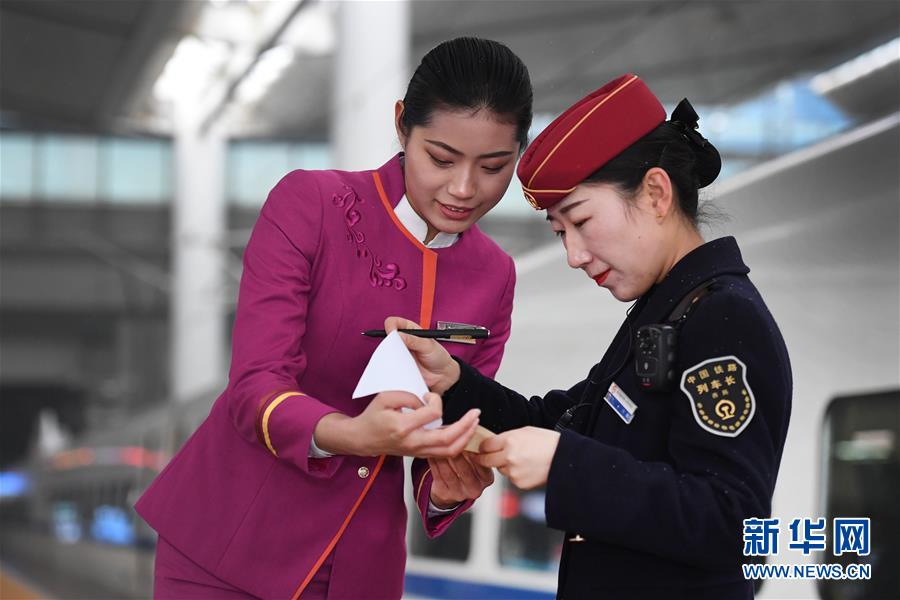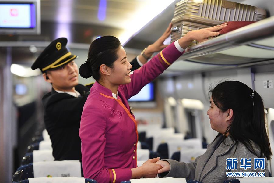 吉如(左)將盲人旅客吳瀟護(hù)送上車后,與列車長(zhǎng)進(jìn)行交接(1月15日攝)。新華社記者陶明攝