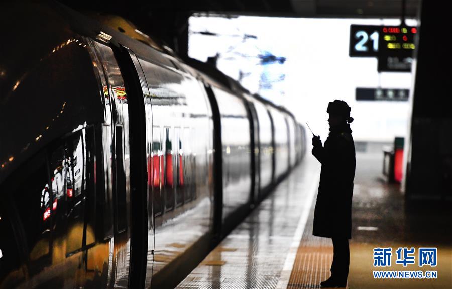 吉如在西安北站站臺(tái)上,與檢票口客運(yùn)人員聯(lián)控(1月14日攝)。今年春運(yùn)列車開行密度大,站臺(tái)崗位人員緊張,吉如時(shí)常被調(diào)到站臺(tái)進(jìn)行站臺(tái)服務(wù)工作。新華社記者陶明攝