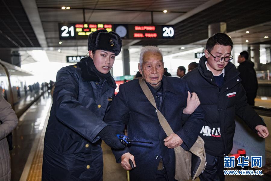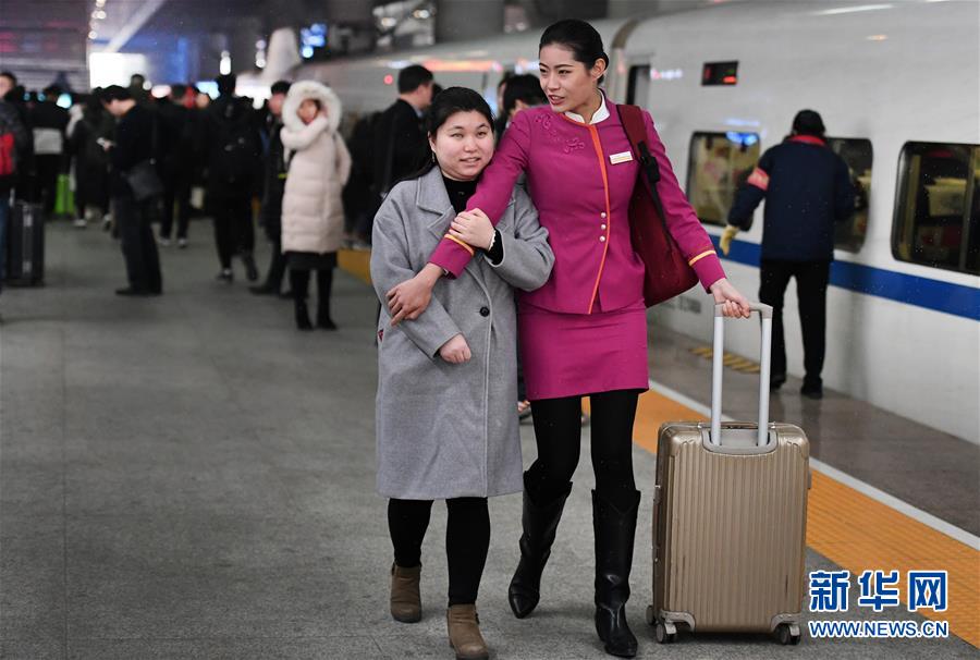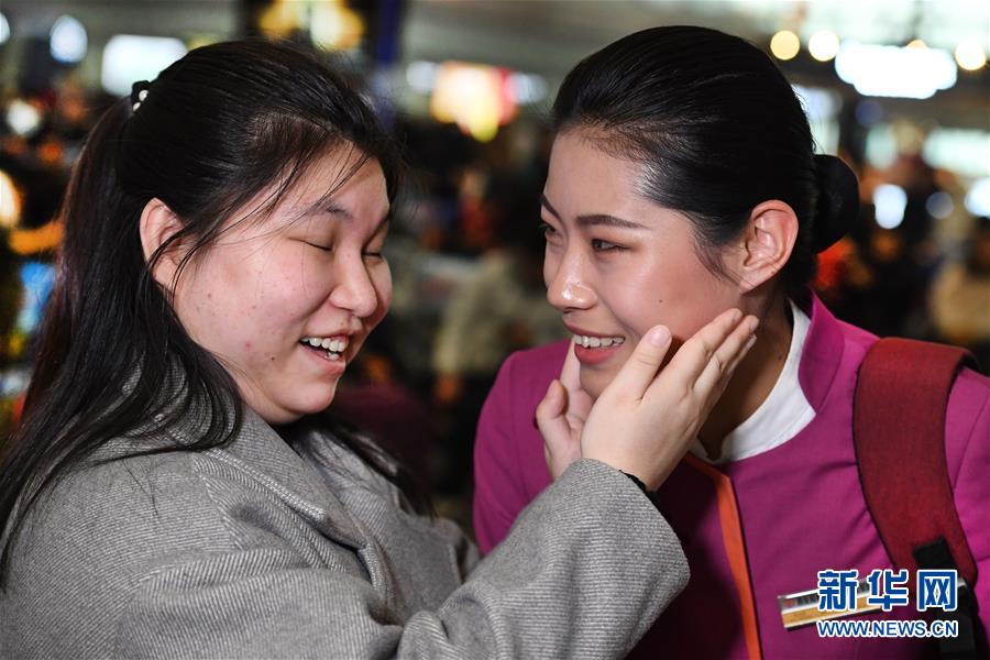 盲人姑娘吳瀟(左)從西安北站中轉(zhuǎn)回延安老家,得到吉如的溫馨服務(wù)。臨別時(shí),吳瀟激動(dòng)地說(shuō):“小姐姐,你的服務(wù)太貼心了,我看不見你,能摸摸你的臉頰嗎?”(1月15日攝)。新華社記者陶明攝