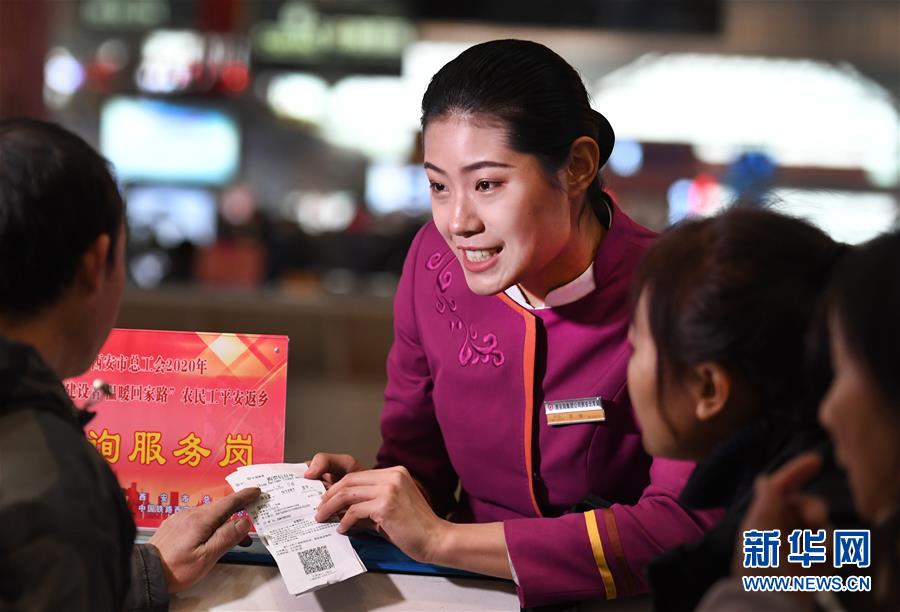 吉如在西安北站咨詢服務(wù)臺(tái)解答旅客的問(wèn)題(1月15日攝)。新華社記者陶明攝
