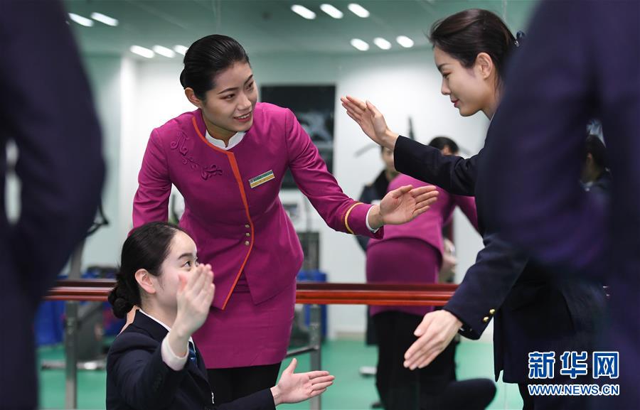吉如(后左一)在車站職工活動(dòng)室指導(dǎo)同事禮儀訓(xùn)練(1月15日攝)。新華社記者陶明攝