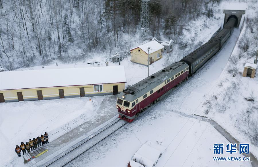 1月7日,西羅奇維修工隊工作人員在雪地上寫下“一路平安”為經(jīng)過的列車旅客送上祝福(無人機(jī)照片)。新華社記者王毓國攝