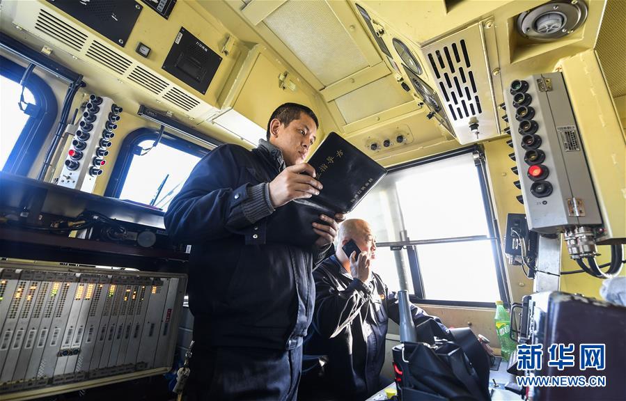 機(jī)車司機(jī)杜洪峰(右)與副司機(jī)謝振國(guó)進(jìn)行開車前的例行檢查(1月17日攝)。新華社記者許暢攝