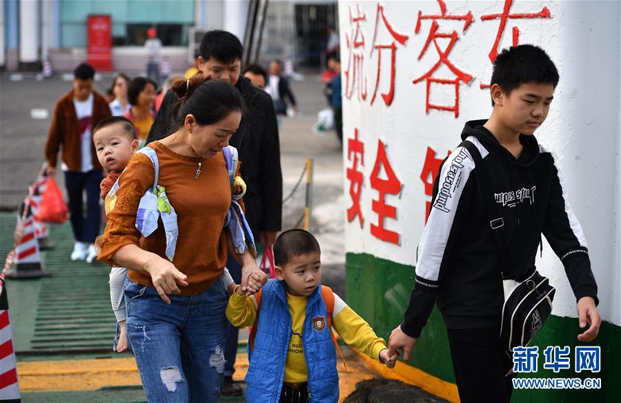 1月19日,來自湖南的務工人員在??谛阌⒏圯喍纱a頭登船返鄉(xiāng)。 新華社記者 郭程 攝