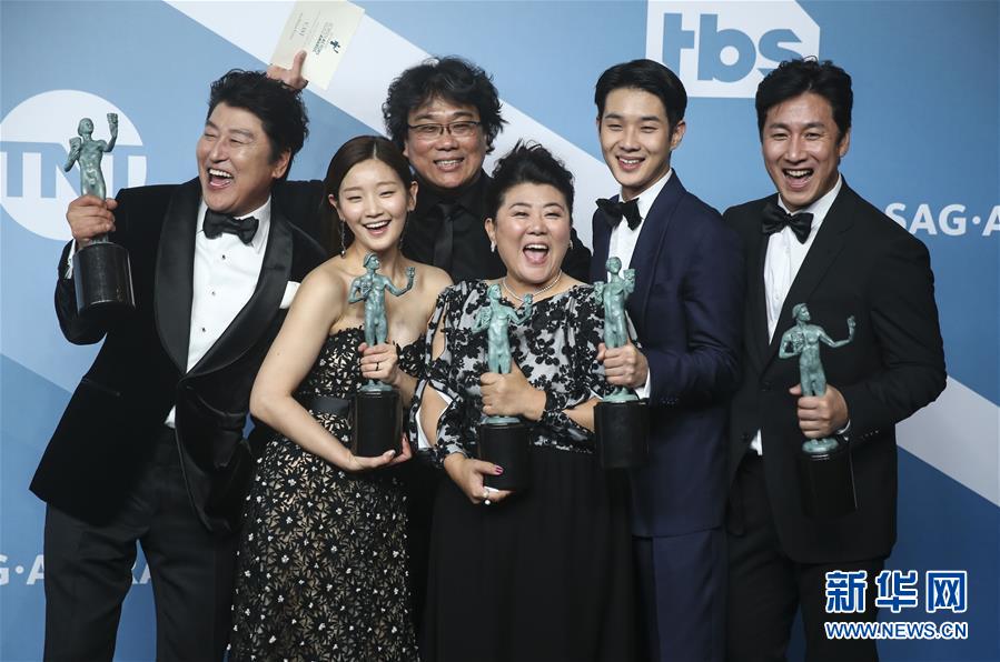 1月19日,在美國洛杉磯,韓國黑色喜劇片《寄生蟲》主創(chuàng)人員展示獎(jiǎng)杯。 新華社記者 李穎 攝