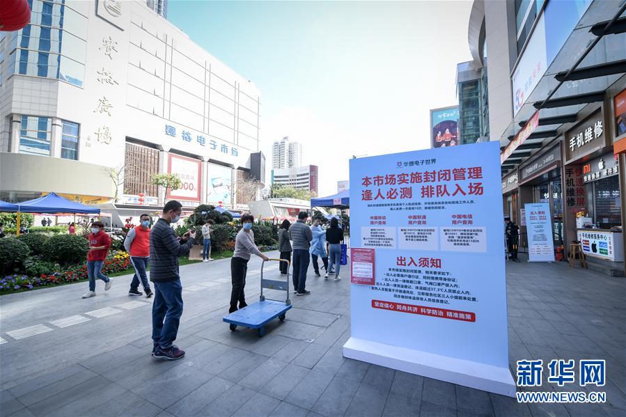 2月24日,在深圳華強(qiáng)北的華強(qiáng)電子世界門外,商戶排隊(duì)等待進(jìn)入市場。 新華社記者 毛思倩 攝