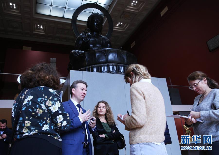 3月2日,在法國(guó)巴黎,賽努奇亞洲藝術(shù)博物館館長(zhǎng)埃里克·勒菲弗(左二)接受媒體采訪。法國(guó)巴黎賽努奇亞洲藝術(shù)博物館經(jīng)過數(shù)月修繕后2日迎客,以更加豐富的展品、全新場(chǎng)景布置和多媒體呈現(xiàn)方式向觀眾展示中國(guó)文化和亞洲文化魅力。新華社記者高靜攝